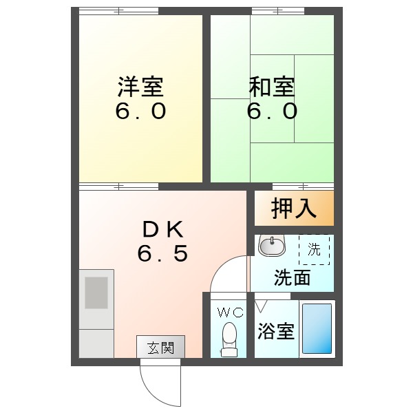 42.18㎡設備:バス・トイレ別 洗面化粧台 シャワー 温水洗浄便座 室内洗濯機置場 プロパンガス給湯 エアコン1台